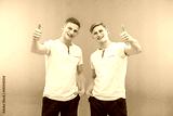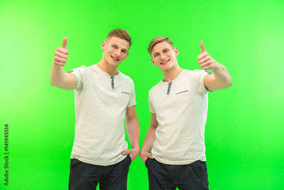 The two happy twin brother thumb up on the green background