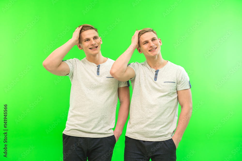The two smile twin brother gesture on the green background
