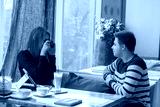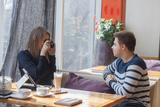 Cheerful couple dating in a cafe. They are having fun and smiling making pictures from retro photo camera. They are looking at each other.