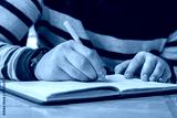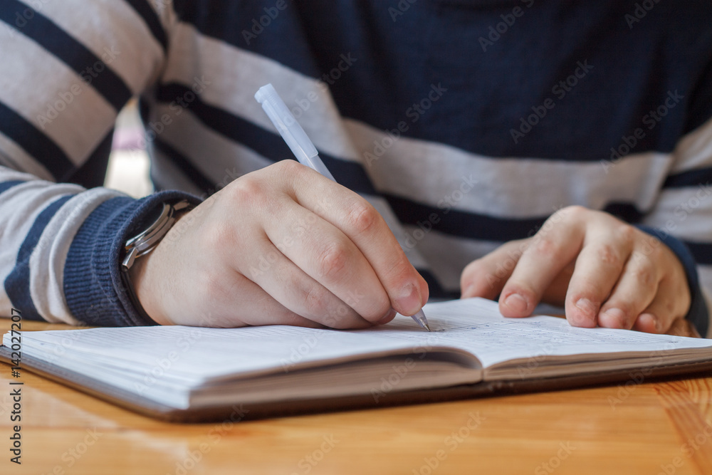Closeup of male hands with pen writing in notebook or notepad.