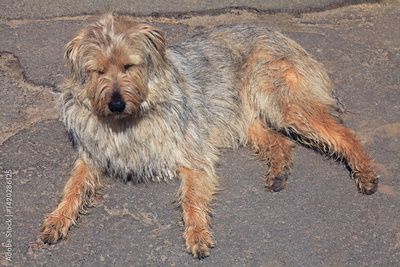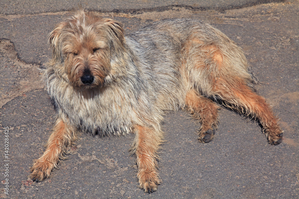 Shaggy dog. Overgrown, untrimmed and dirty dog. Homeless dog with shaggy fur and beard. Street dog resting on the asphalt. Shaggy, dirty and uncombed terrier dog. Homeless, unwashed dog without owner