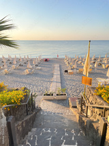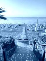 Stone staircase leading to tranquil beach, Giardini Naxos, Sicily, Italy.