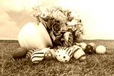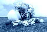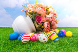 Easter eggs with artificial flower on Fresh Green Grass