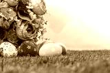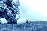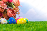 Easter eggs with artificial flower on Fresh Green Grass