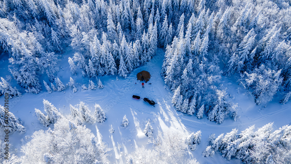 Aerial view of a camp in the forest on a cold winter day, during a snowmobile expedition