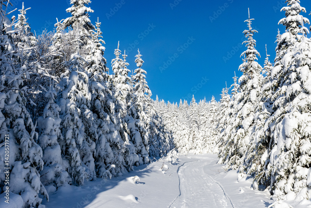 Winter trail through the snow-covered boreal forest on a beautiful winter day