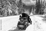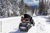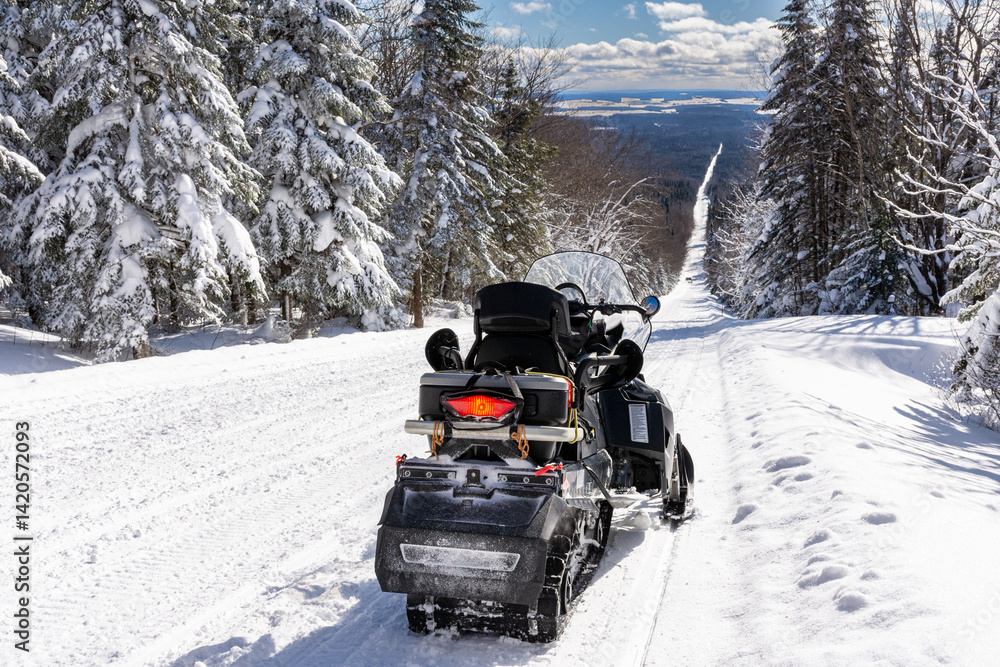 Snowmobile parked on a trail through the snowy forest on a beautiful winter day