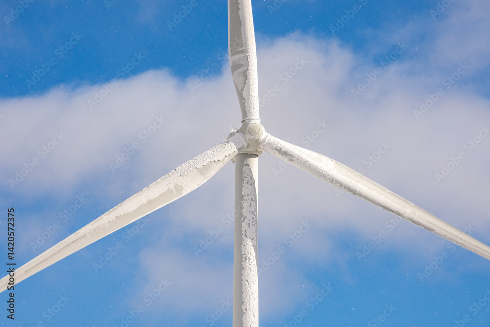 Close-up view of an ice-covered wind turbine on a beautiful winter day