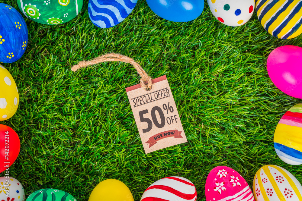 Easter eggs Sale Coupon, voucher, tag on Fresh Green Grass