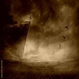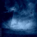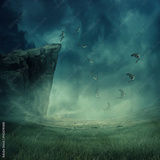 Young boy jumping from the edge of a cliff, falling down while his wings grow and help to fly. Astral travel, mystical rapture state psychokinesis condition. Magic soul energy show human illusion.