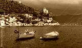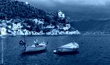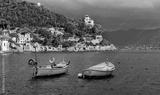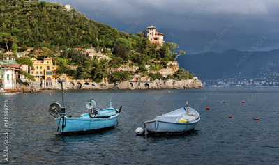 Stormy sky and small boats in sea bay of Portofino town. Portofino is small fishing town in Liguria district in Italy.