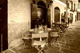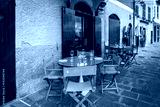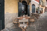 Wooden table near traditional Italian cafe in Portofino town, Italy