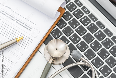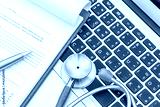 Stethoscope and prescription on laptop