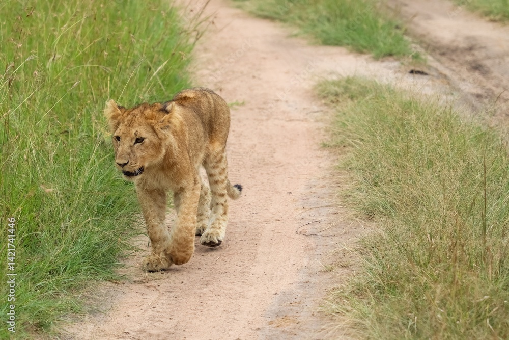 Young Lion Walking on a Dirt Path in the African Savannah