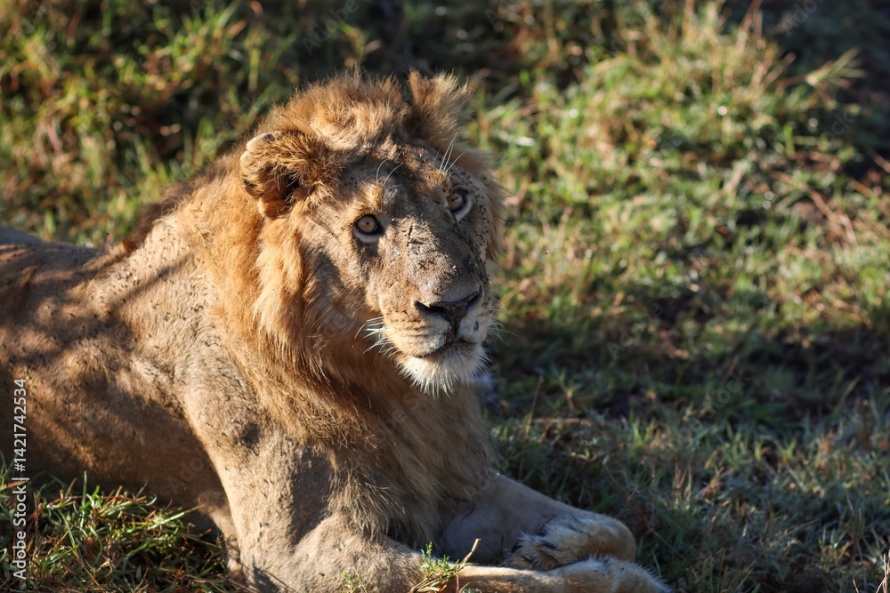 Majestic Lion Resting in Sunlit Grassland