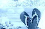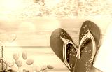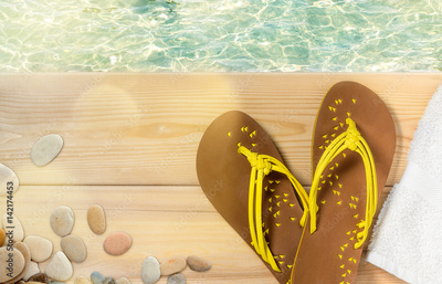 Summer beach vacation, flip flops, towel and sea pebbles on wood deck