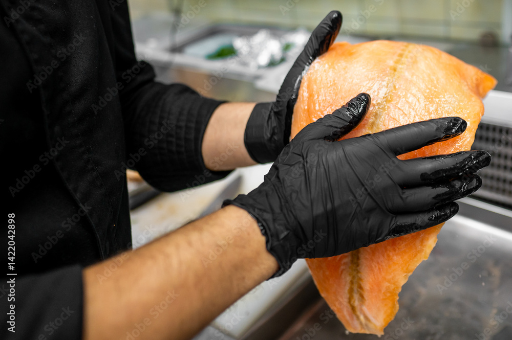 A chef in black gloves carefully handles a large piece of salmon, preparing it for cooking. The focused attention showcases the precision and skill involved in seafood preparation.