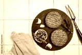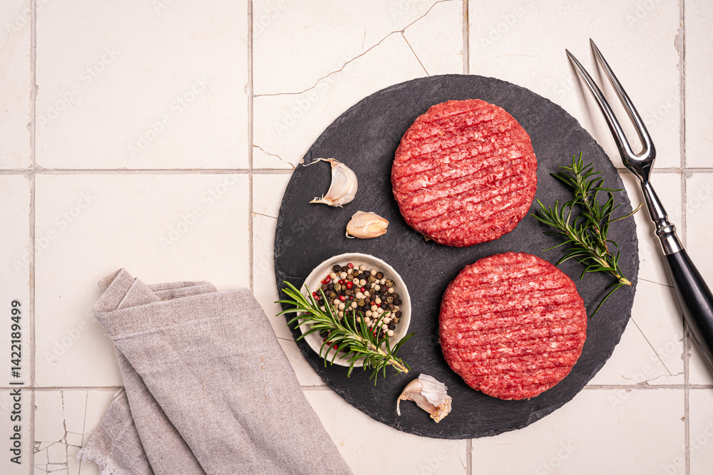 Raw steak burgers patties with ground beef and spices on a cutting board. White background, top view.