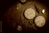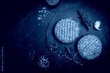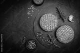 Raw steak burgers patties with ground beef and spices on a cutting board. Dark background, top view.
