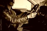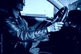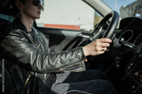 Cool blonde woman in a car driver seat driving wearing sunglasses and cool leather jacket, cool girl driver fast speed
