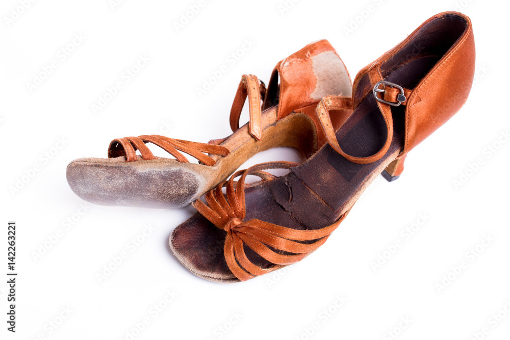 closeup shot of pair of worn-out latin ballroom dance shoe - isolated