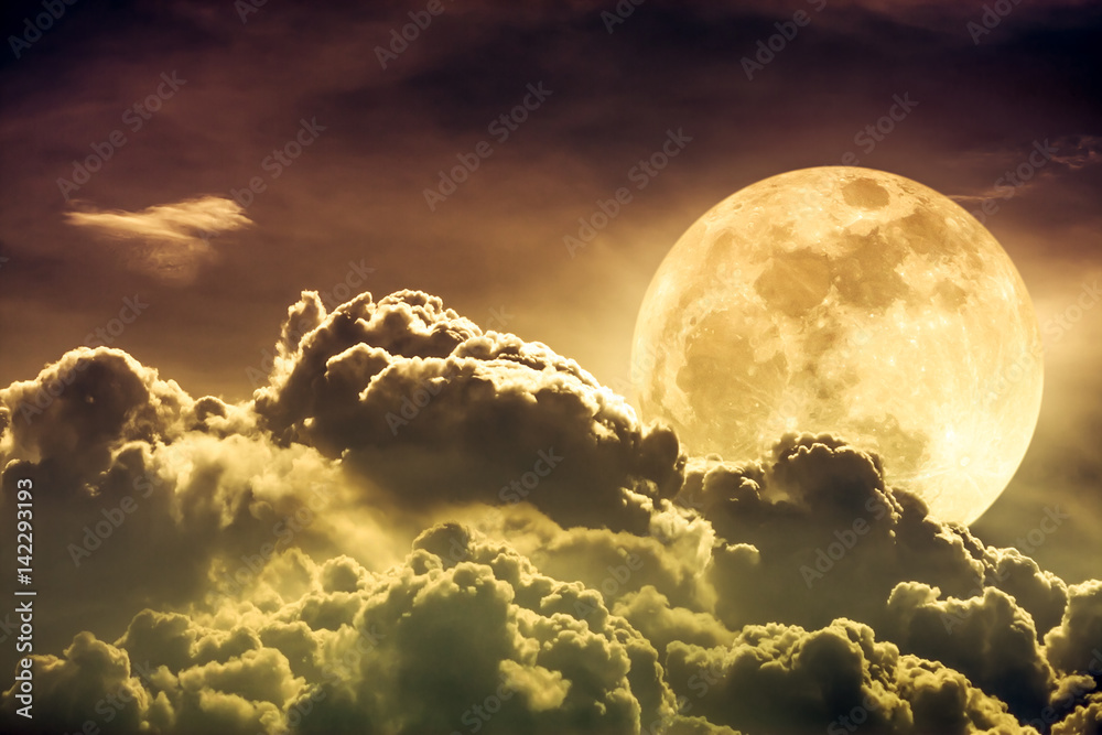 Nighttime sky with clouds and bright full moon with shiny. Sepia tone.