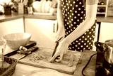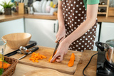 Close up of woman cooking healthy foods in kitchen in morning at home.