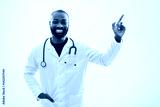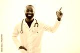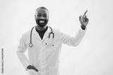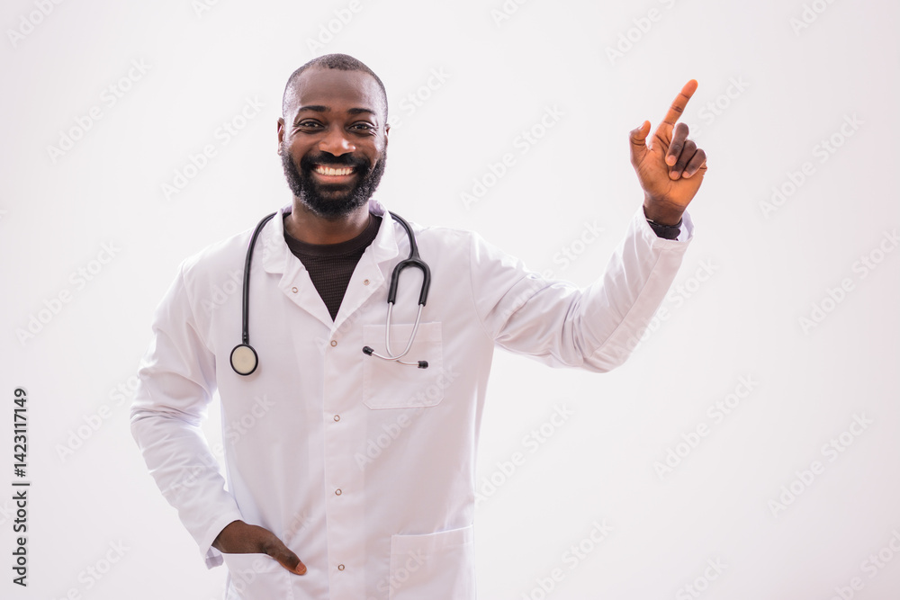 Portrait of African American doctor who is pointing upward with cheerful smile. Copy space for your text or advertisement.