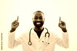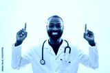Portrait of smiling African doctor who is pointing upside on the gray background. Copy space for your text or advertisement.