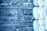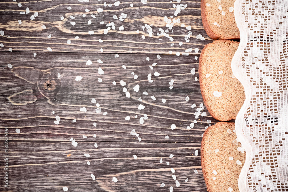 Slices of black grain bread and coarse sea salt on a wooden table.