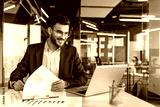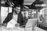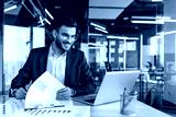 A smiling businessman reviews documents, with a laptop open on his desk in a modern office setting, ready to work.