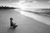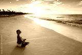 Middle-aged woman does yoga on the beach at dawn