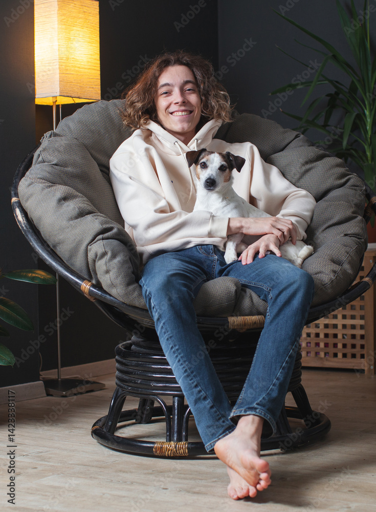 Man sitting on sofa with dog at home