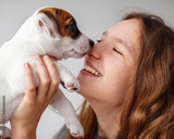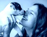 Woman Playing with cute Puppy Dog at home