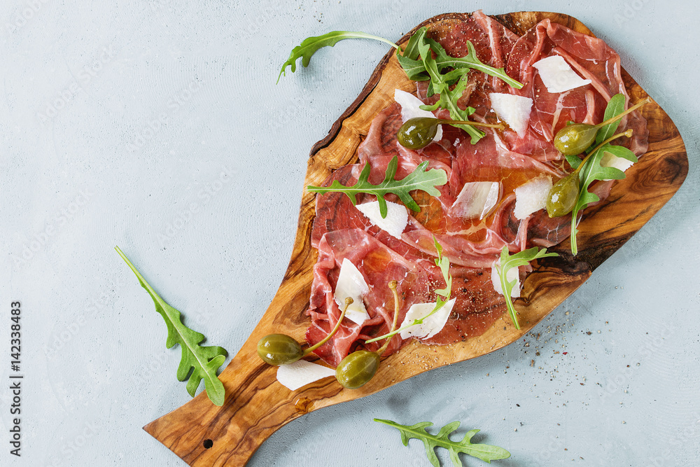 Beef carpaccio on olive wood serving board with capers, olive oil cheese and arugula, served over blue stone texture background. Top view with space for text.