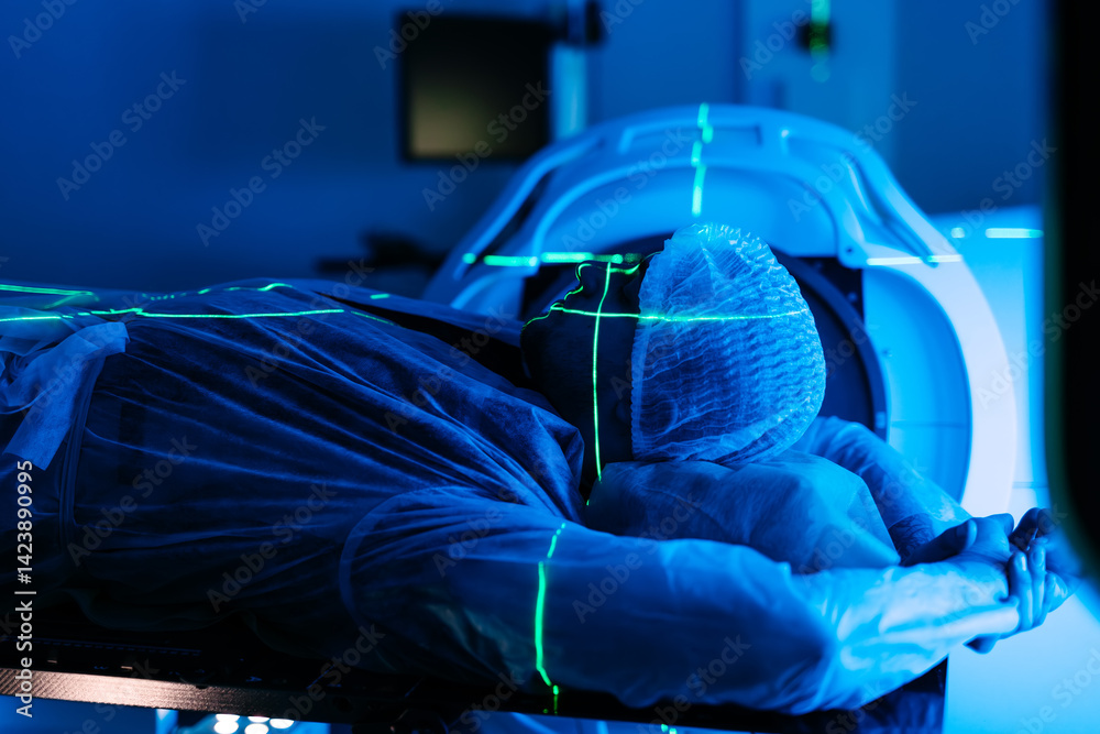 Modern approaches to oncology treatment. A man undergoes radiation therapy for cancer in a modern oncology clinic using a linear accelerator.