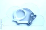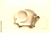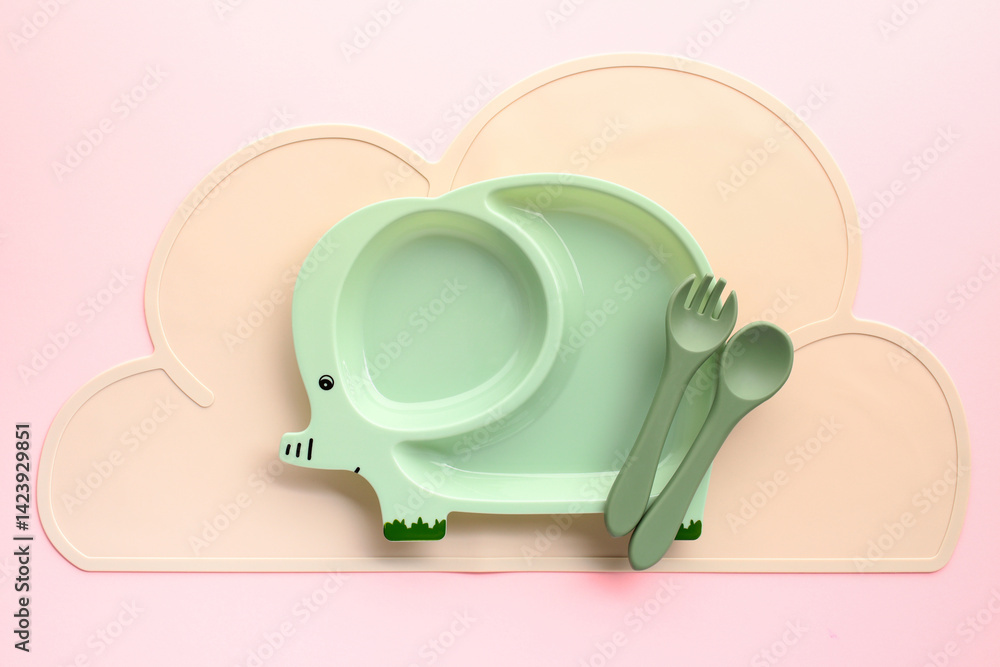 Adorable elephant-themed kids dining set in light green silicone, featuring plate, fork, spoon on cloud placemat. Pink backdrop.