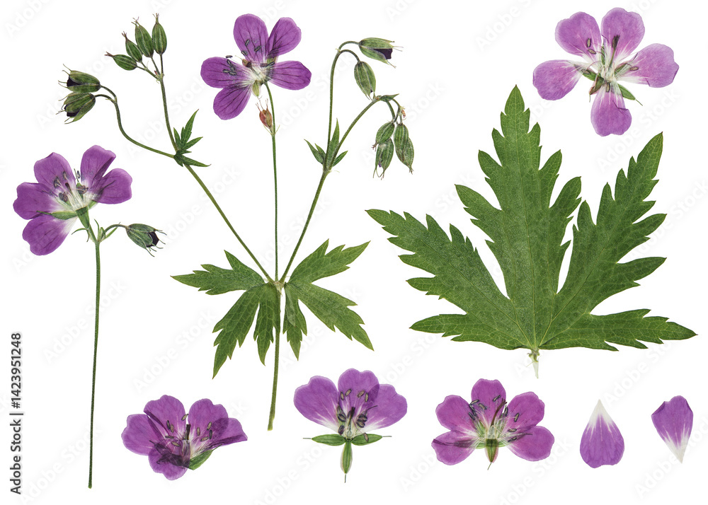 Digital herbarium, scrapbooking. Set of dry flowers lilac geranium and leaves. Pressed flower pelargonium for floristry. Herbarium. Forest geranium. Flowers, leaves isolated on a white background.