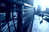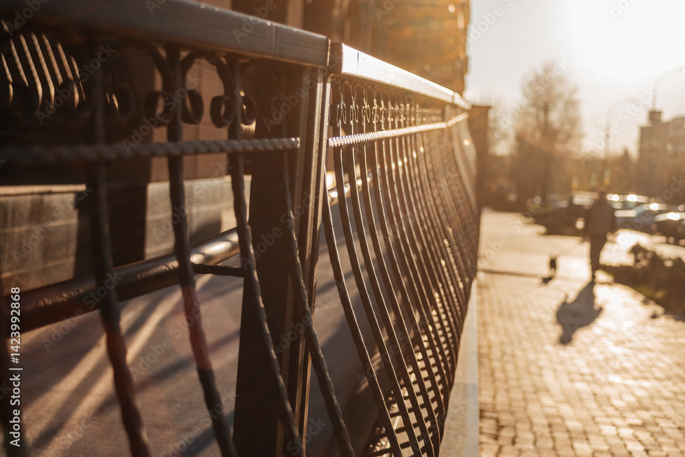 City scene. Metal railing glowing in warm sunset light with a city sidewalk in the background. Peaceful sunset scene with golden tones and soft depth.