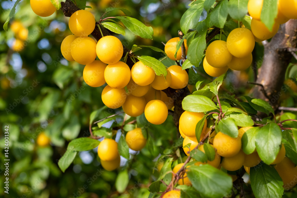 Abundant harvest of yellow Mirabelle plums (Prunus domestica subsp. syriaca) on tree branches with green leaves