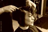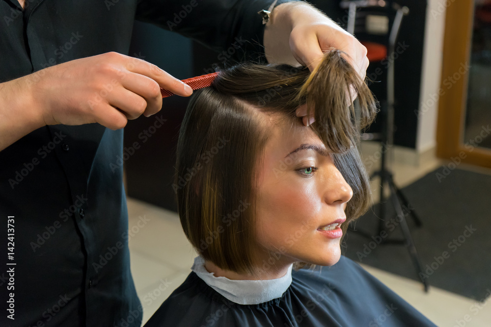 Male hairdresser is preparing for haircut of Beautiful woman in the beauty salon.