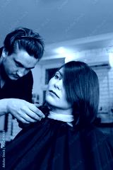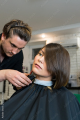Male hairdresser is preparing for haircut of Beautiful woman in the beauty salon.