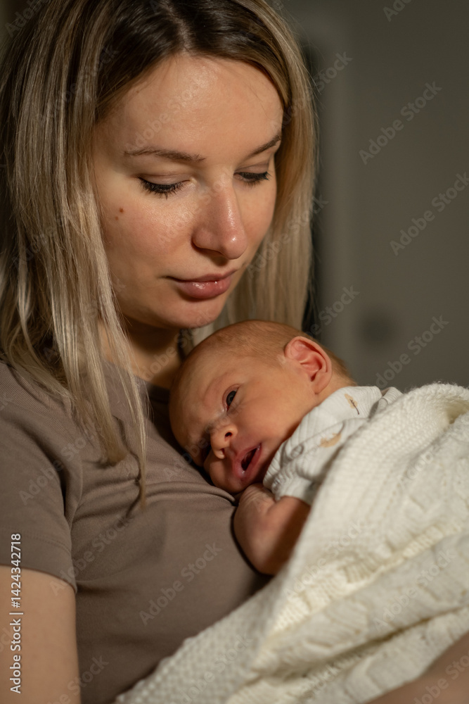 Loving mother holds her newborn baby close during a quiet moment at home in warm evening light