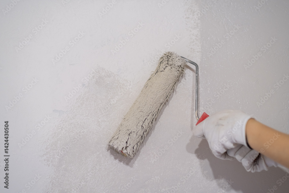 A woman manually paints a wall with a paint roller. Painting the apartment