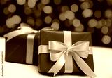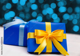 Gift boxes on blurred background. Colored presents wrapped with paper, bow and ribbons. Christmas or birthday packages. Celebration design.