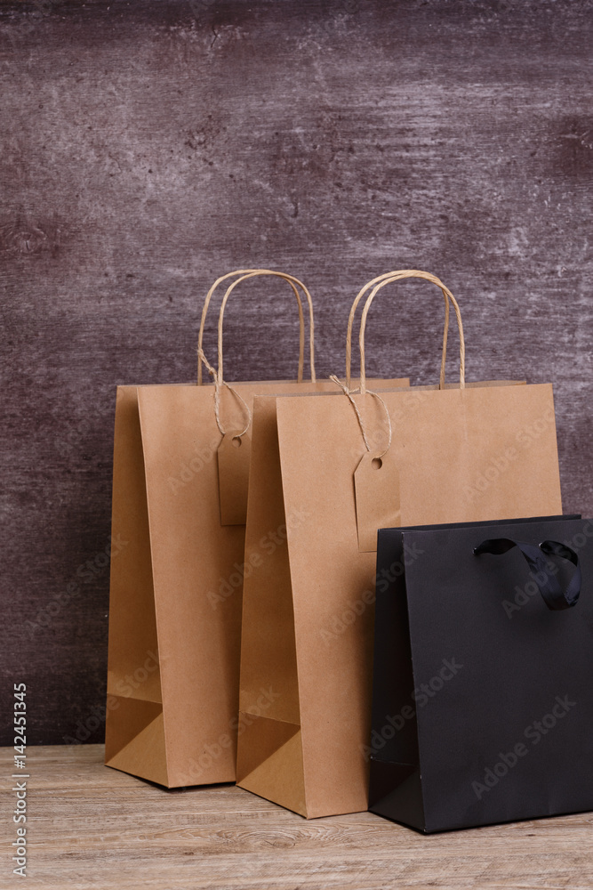 Mockup of blank shopping bags. Brown and black craft packages. Concept for sales or discounts. Recycled paper. Wooden rustic board.