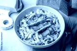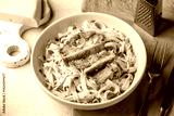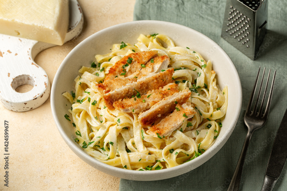 Fettuccine Alfredo creamy pasta with chicken breast in a white plate.