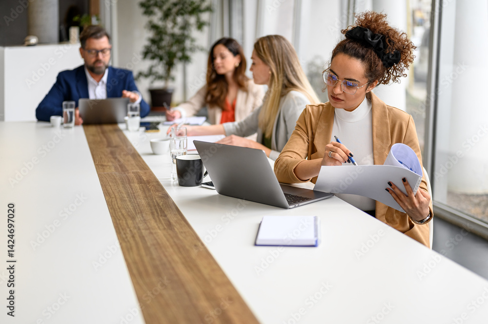 Confident businesswoman reviewing documents and working on a laptop while colleagues collaborate in the boardroom