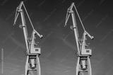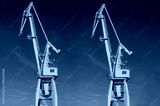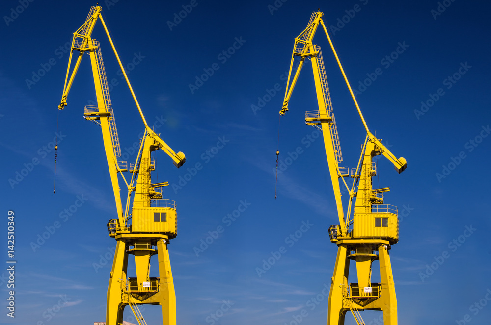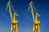 Port crane, yellow, blue sky.