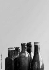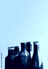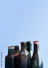 Ancient design glass bottles on blue background. Colorful aged dirty flacon set. copy space, vertical photo.